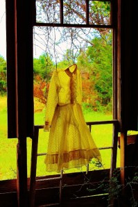 Sally Ann has a permanent case of melancholy it seems. She tends to be secretive and at times melodramatic. Light plays upon her as if she were a panel in a stained glass window in some ancient cathedral. But she is all Southern and Baptist and country picnics and summer under the oak trees. Sally Ann likes to read Jane Austen. Sometimes she thinks she was born in the wrong age. In this photo she is posing in front of the broken window of the old Wanetta School House, well what is left of it. The old school is located near Percilla, Texas down a series of winding dirt roads that only the most intrepid would take the time to follow. There are stories that the old school is haunted, that sometimes folks find voodoo dolls scattered across its floors. But Sally Ann saw none of that. The only ghosts besides herself, an old Fisher Price red plastic record player and a mound of dirt dauber nests–a small ziggurat where someone had removed them from the walls, but not from the premises. But still, Sally Ann could feel the presence of the children who once scuffed their shoes across the wooden floors, floors now falling through and riddled with the new growth of small trees. Soon nothing much will be left here. Sally Ann realizes this. Another 30 years and perhaps there will just be boards and rusty nails, a living sculpture of thorn-vines and rubble. Sally Ann herself is aglow with speculation–just who was I? she thinks. I am as unknowable as the sounds that once pulsed between these walls. I am as voiceless as these floors. I am a window, yes, look through me, but to what end? What do you see?